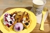 使うのはもちろん、紅花たまごと北海道産ミルク。それに老舗パン屋の湯種製法食パンを浸して、外はカリッ、中はふわっと仕上げます。しあわせプリンを載せた魅惑のデザート系や、ベーコンなどと合わせた食事系もあり、朝から夜までいつでもおいしい看板メニュー。