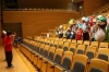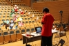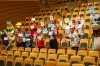 お面ができたら大ホールへ。客席を舞台に、カエルたちが動き回る写真の撮影です。